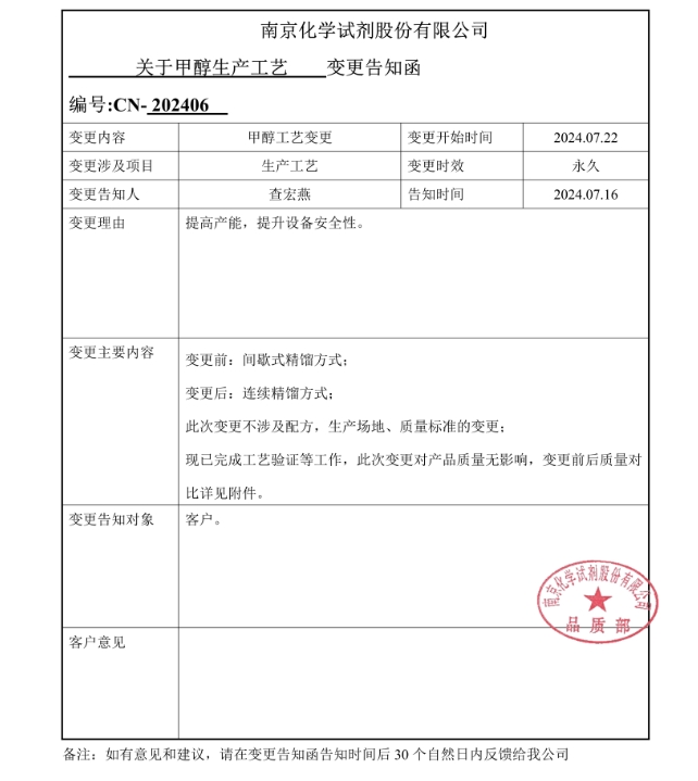 首頁 > 新聞中心 > 企業公告 關于甲醇生產工藝變更告知函