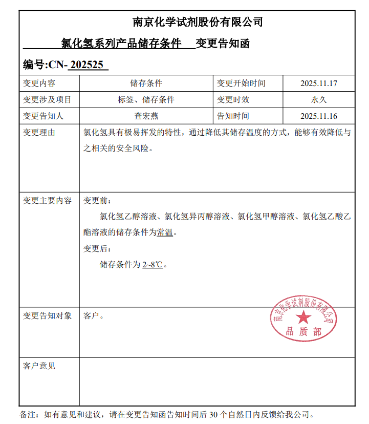 氯化氫系列產品儲存條件變更告知函