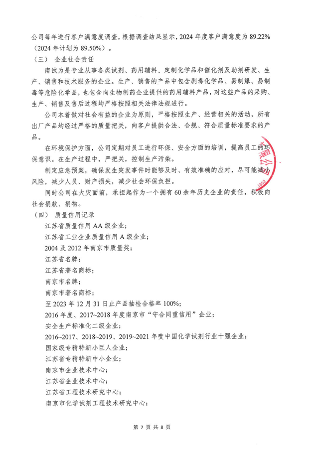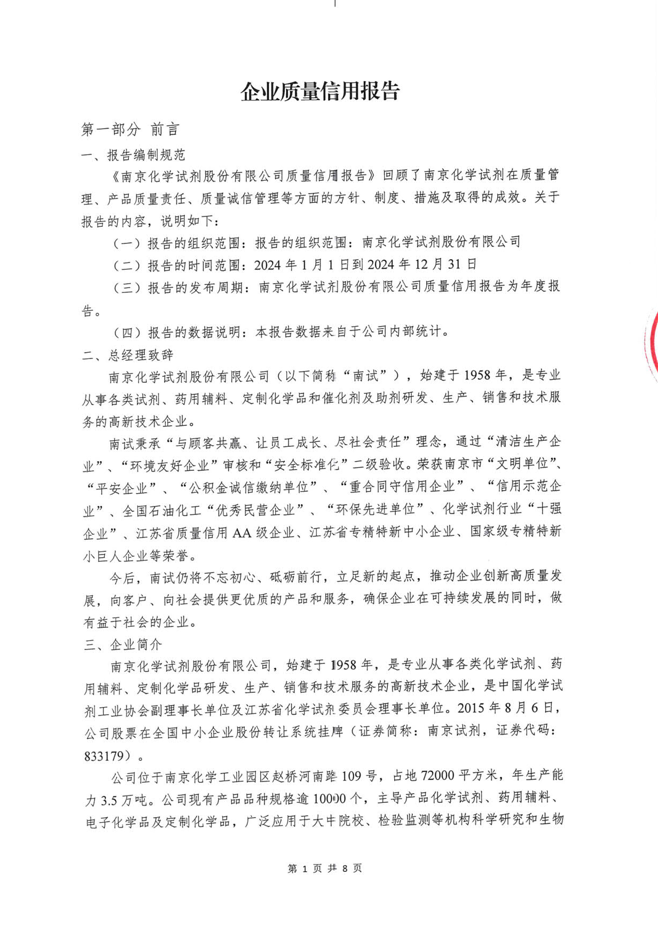 《南京化學(xué)試劑股份有限公司質(zhì)量信用報告》回顧了南京化學(xué)試劑在質(zhì)量管理、產(chǎn)品質(zhì)量責(zé)任、質(zhì)量誠信管理等方面的方針、制度、措施及取得的成效。關(guān)于報告的內(nèi)容,說明如下: