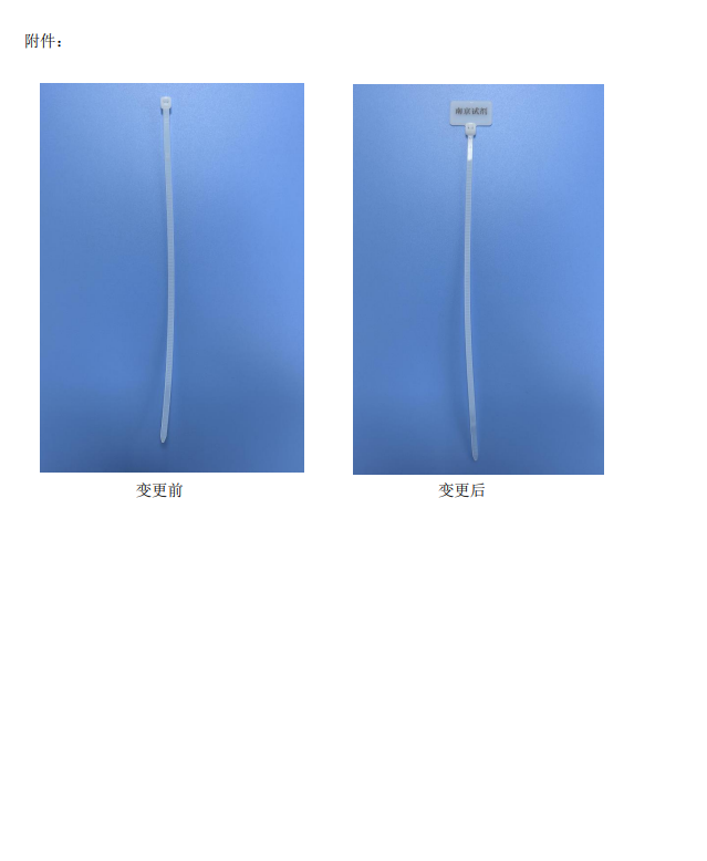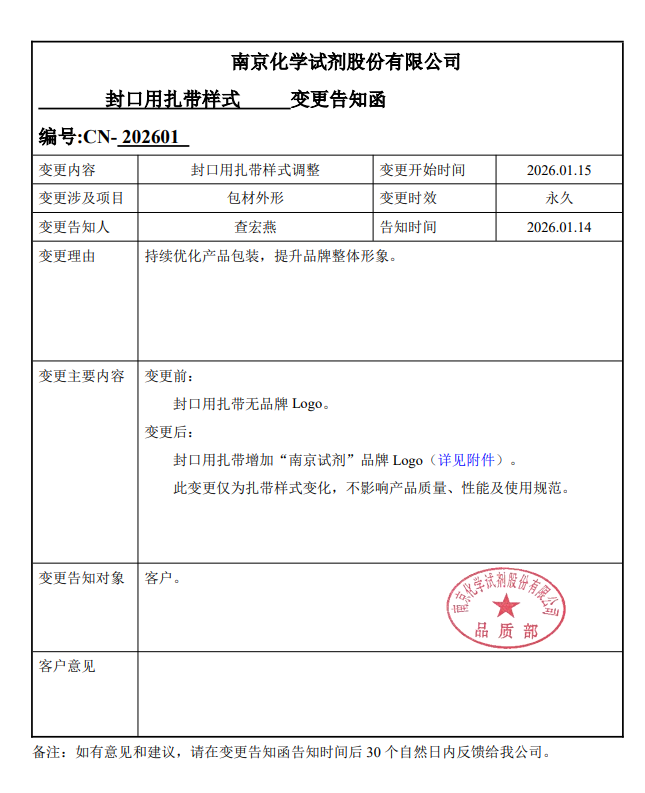 變更后: 封口用扎帶增加“南京試劑”品牌 Logo(詳見附件)。此變更僅為扎帶樣式變化,不影響產品質量、性能及使用規范。