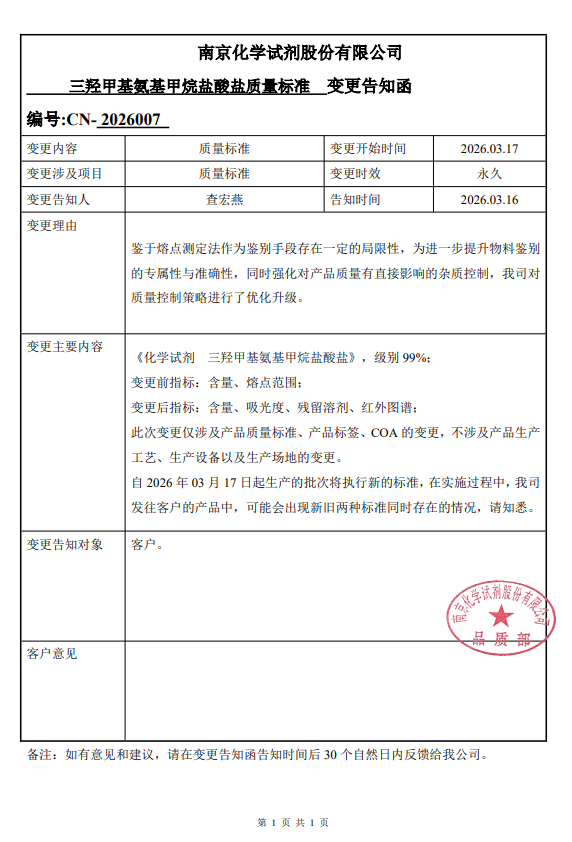 不涉及產品生產工藝、生產設備以及生產場地的變更。自 2026 年 03 月 17 日起生產的批次將執行新的標準,在實施過程中,我司發往客戶的產品中,可能會出現新舊兩種標準同時存在的情況,請知悉。
