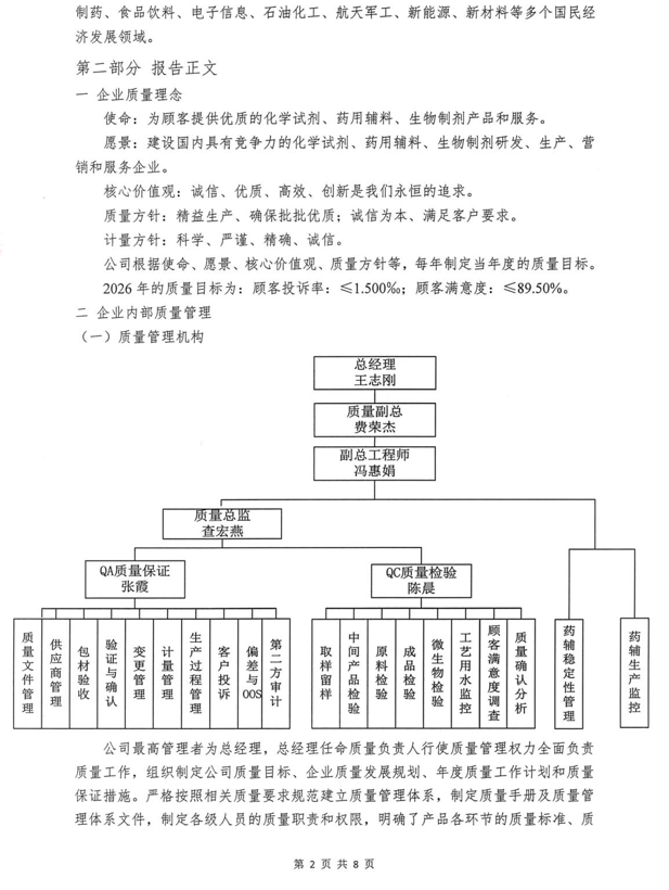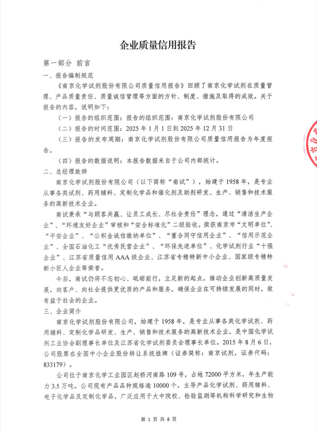 第一部分 前言 企業質量信用報告 一、報告編制規范 《南京化學試劑股份有限公司質量信用報告》回顧了南京化學試劑在質量管 理、產品質量責任、質量誠信管理等方面的方針、制度、措施及取得的成效。