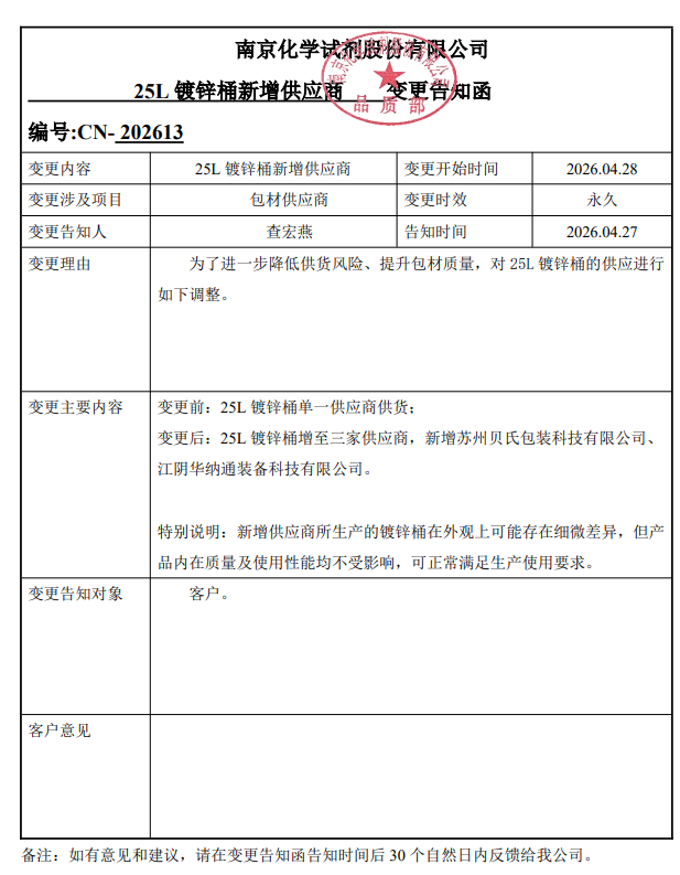 為了進一步降低供貨風險、提升包材質量,南京化學試劑股份有限公司對25L 鍍鋅桶的供應進行如下調整。